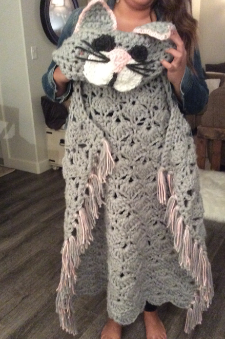 It is a crochet patter from MJ's Off the Hook and its the hooded owl pattern that's everywhere right now! However, I am not a fan of owls and my granddaughter loves cats SO, I created my own version of the blanket using MJ's pattern but creating my own cat face for the hood. It took some figuring because this is my very first crochet project. I watched a lot of you tube videos! MJ also does a wonderful tutorial on how to crochet her shell pattern so thanks to her I was able to make the blanket!! What's really cute about it is that it folds up into a pillow!!